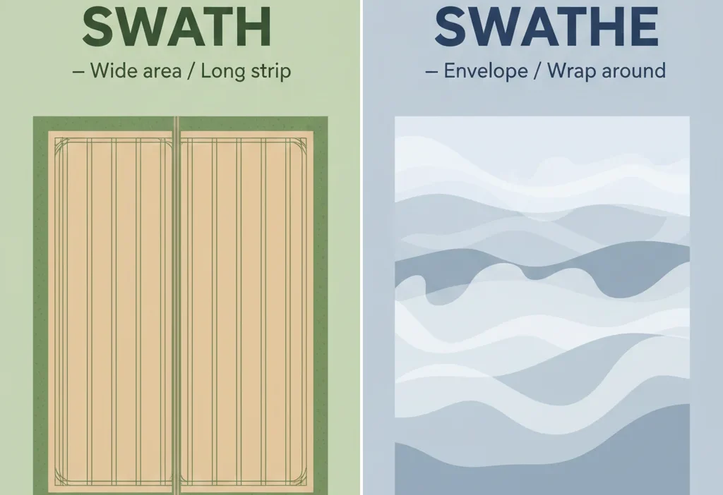 The confusion between swath / swathe comes from spelling variation, grammar roles, and regional English differences. Once you understand that swath is a noun and swathe is a verb, the choice becomes simple. If you are describing a wide area, such as land, people, or impact, swath is correct. If you are talking about covering or wrapping, swathe is the right word.